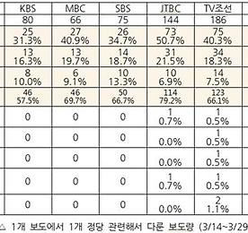 '옥새들고 나르샤' 반복재생, 방송뉴스 새누리당이 61% 1개 정당 다룬 보도만 뽑아보니, 7개 방송에서 새누리당 414건, 더민주+국민의당은 253건 4‧13총선이 불과 일주일여 앞으로 다가왔지만, 언론을 보는 유권자들은 총선에 임하는 정당이 단 3개 밖에 없다고 인식할지도 모르겠다. 총선보도감시연대가 19차 보고서(보고서)를 통해 공개한 분석결과에 따르면 지상파 3사나 종편 모두 보도가 새누리당, 더불어민주당, 국민의당에 쏠려있다. 총선보도감시연대가 지난달 14일부터 29일까지 보름여 간 KBS 뉴스9, MBC 뉴스데스크, SBS 8뉴스, JTBC 뉴스룸, TV조선 뉴스쇼판, 채널A 종합뉴스, MBN 뉴스8 등 각 방송사 메인뉴스 보도를 분석한 결과 1개 보도에서 1개 정당을 다룬 보도는 지상파의 경..
